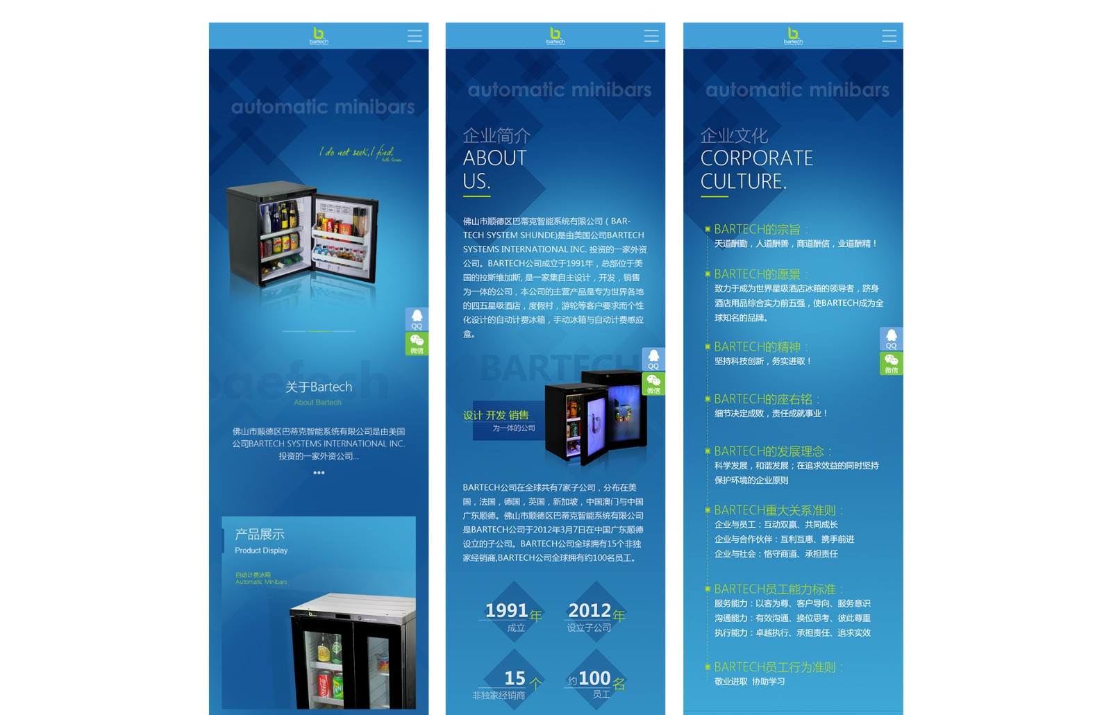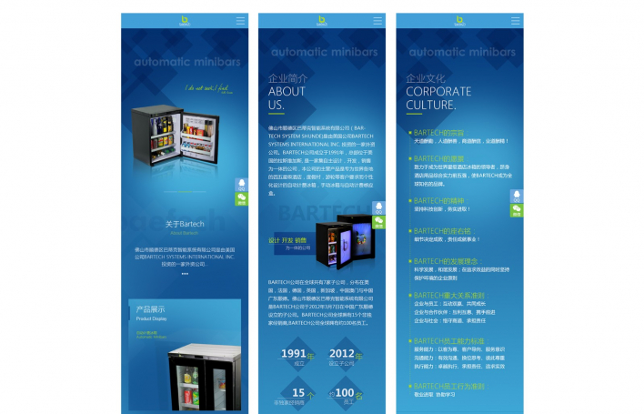 佛山市順德區(qū)巴蒂克智能系統(tǒng)有限公司(BARTECH SYSTEM SHUNDE)是由美國(guó)公司BARTECH SYSTEMS INTERNATIONAL INC. 投資的一家外資公司。BARTECH公司成立于1991年,總部位于美國(guó)的拉斯維加斯, 是一家集自主設(shè)計(jì),開(kāi)發(fā),銷售為一體的公司,本公司的主營(yíng)產(chǎn)品是專為世界各地的四五星級(jí)酒店,度假村,游輪等客戶要求而個(gè)性化設(shè)計(jì)的自動(dòng)計(jì)費(fèi)冰箱,手動(dòng)冰箱與自動(dòng)計(jì)費(fèi)感應(yīng)盒。